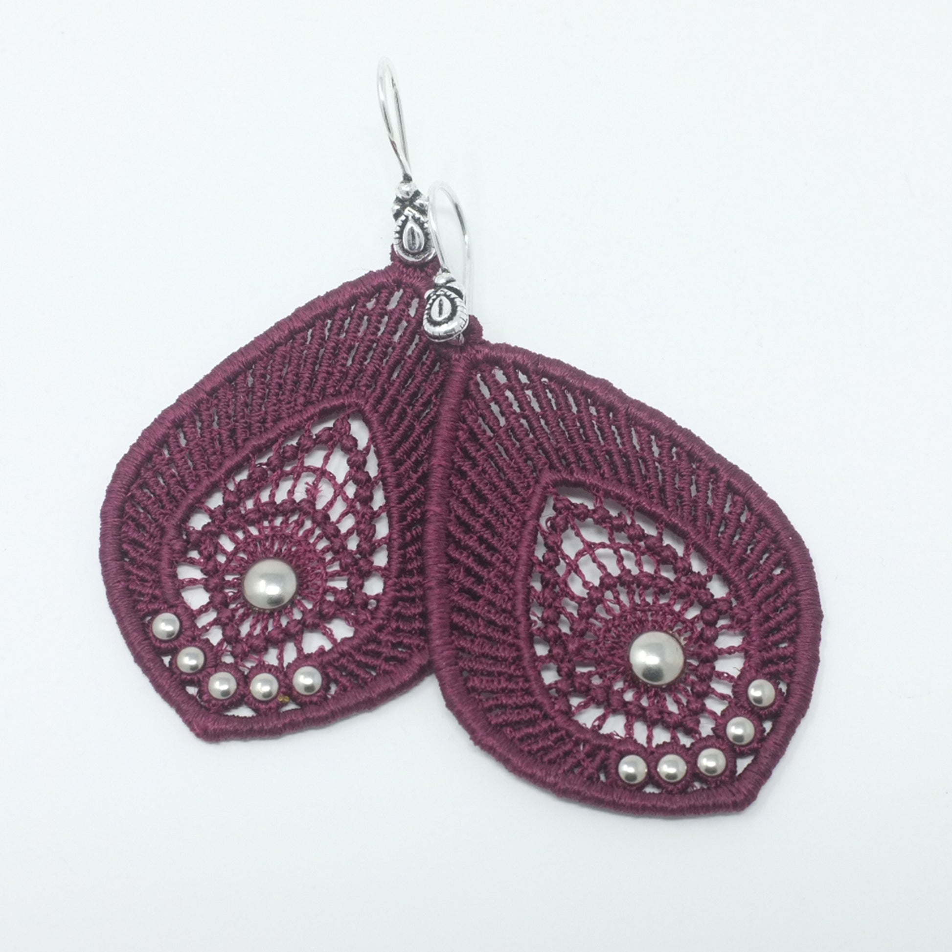 Burgundy Teardrop Lace Earrings with Silver Beads