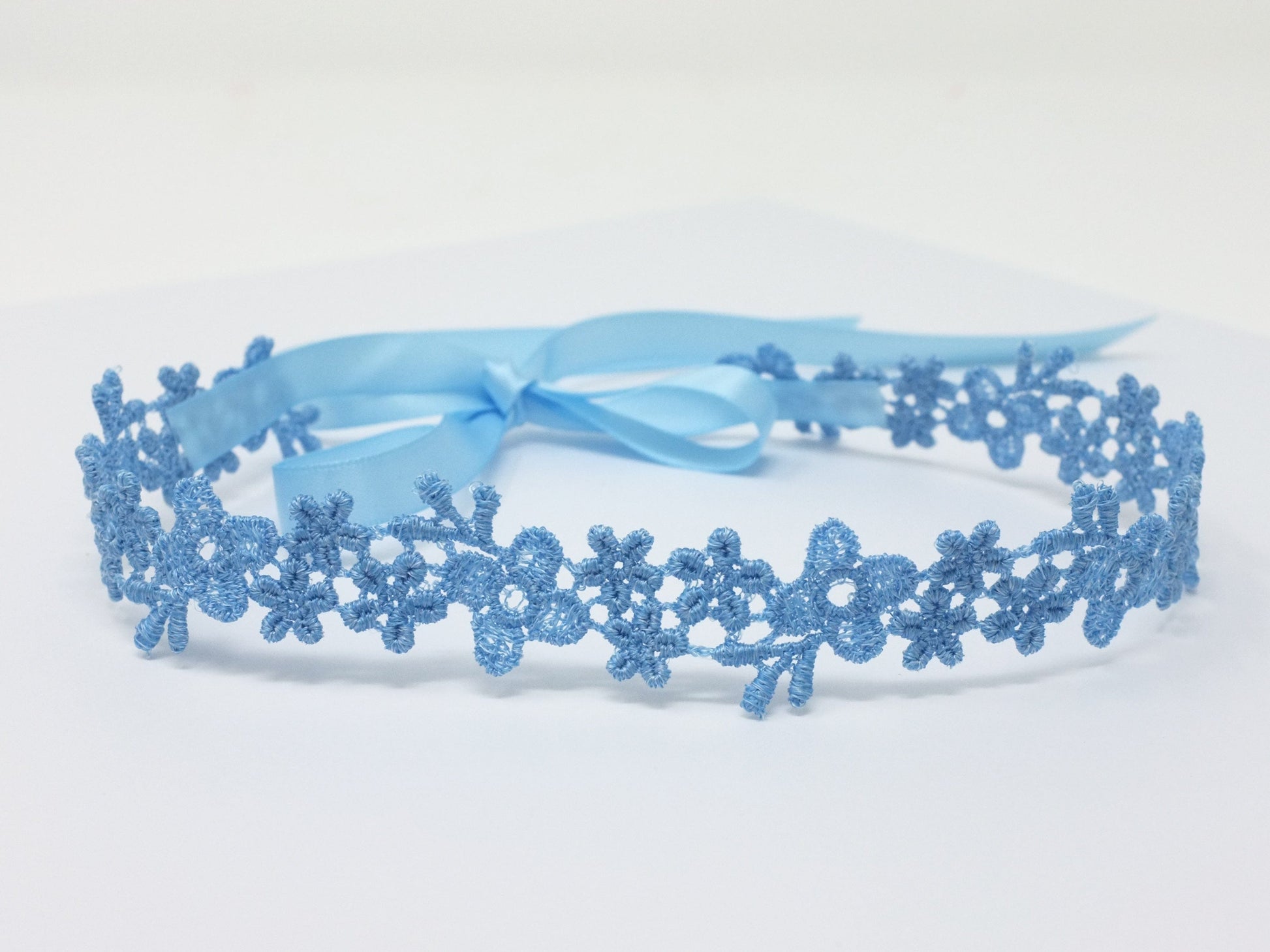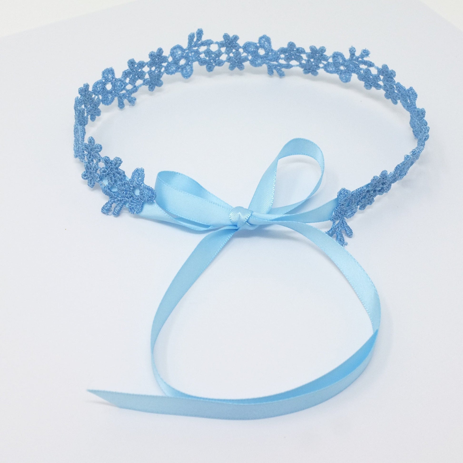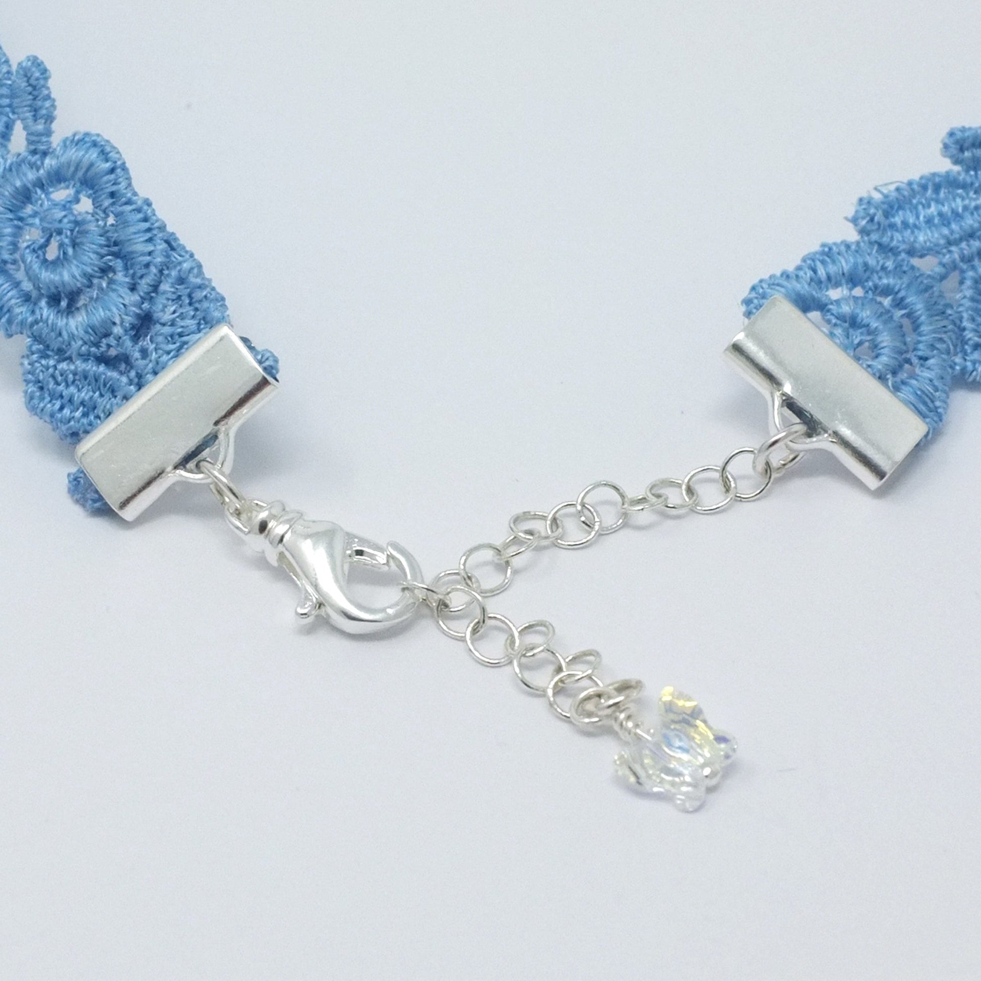 • Blue Satin Ribbon. Approx. 13 inches of ribbon is sewn to each side of the lace choker.