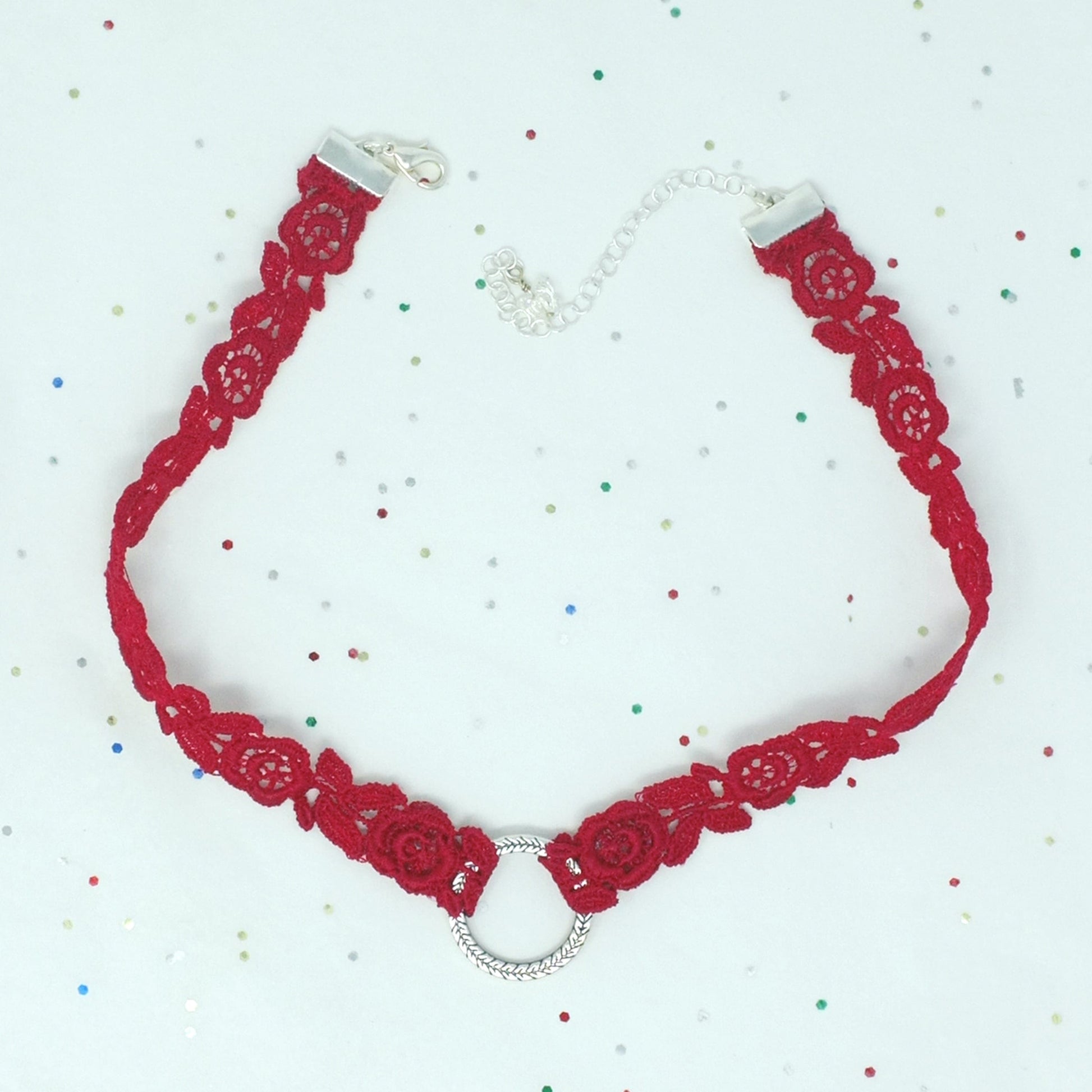 The soft red rose lace is sewn around the metal ring, to give you the freedom to wear this lace necklace in 2 different ways: as a choker, with the silver metal ring aligned with the lace, or as a ring pendant necklace wearing it over the collarbone and sliding the lace to the top of the carved silver ring.